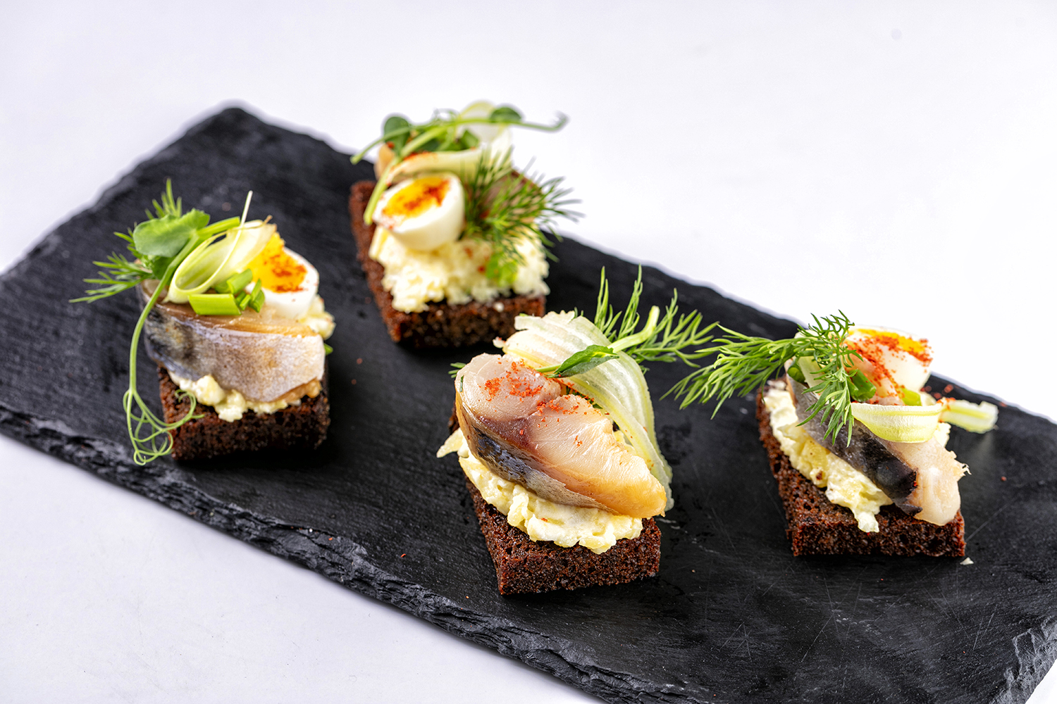 холодного копчения, соусом из печеного картофеля, перепелиным яйцом и зеленью