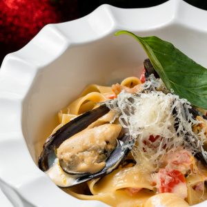 С креветками и мидиями в томатно-сливочном соусе.