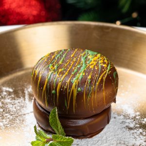 с фисташковым пралине, миндальным бисквитом, грецким орехом, медом и сливочным муссом из белого шоколада.