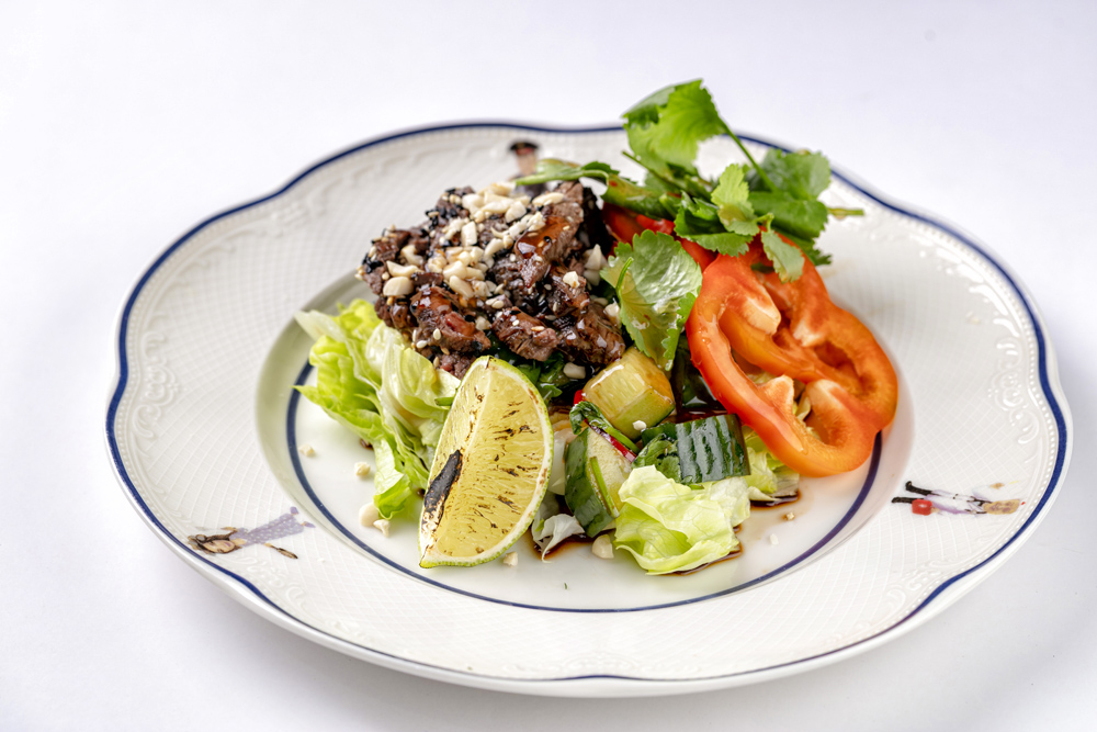 с битыми огурцами, сладким перцем, арахисом и соусом лайм-чили